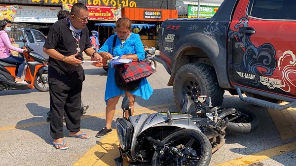 ขณะที่ชาวบ้านที่เห็นเหตุการณ์เล่าว่า ก่อนเกิดเหตุเห็นรถกระบะขับออกจากหน้าร้านก๋วยเตี๋ยวฝั่งตรงข้าม ก่อนจะเลี้ยวกลับรถ ส่วนรถจักรยานยนต์วิ่งมาทางตรงพุ่งเข้าชนอย่างแรง ส่งผลให้ผู้ขับขี่ได้รับบาดเจ็บดังกล่าว