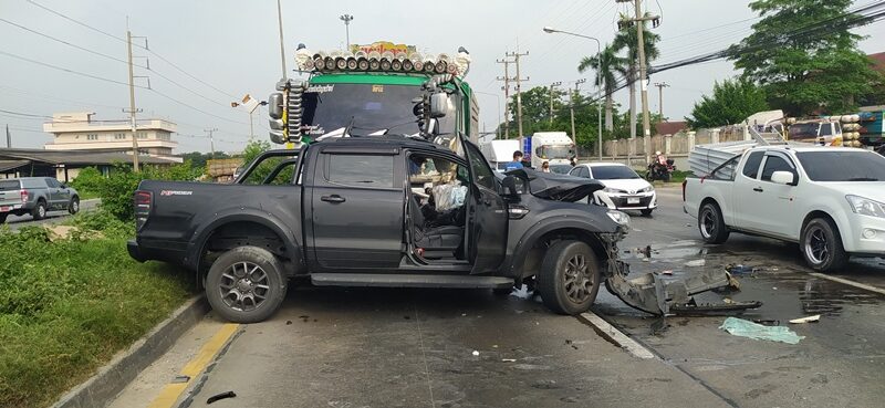 กระบะ Ford Ranger ลื่นน้ำมัน เหินข้ามเกาะชนรถบรรทุกพ่วงดับ 1 ราย