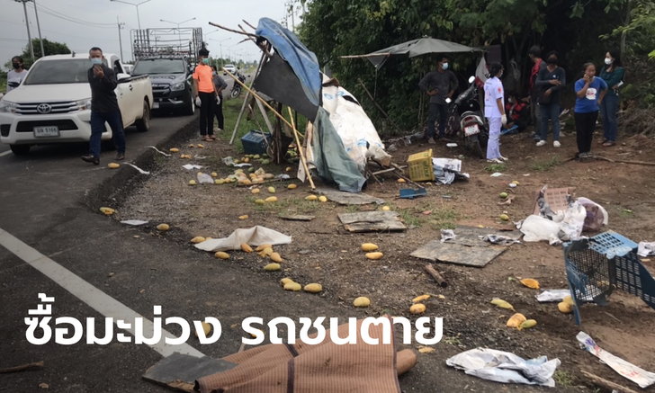 กระบะ Isuzu D-Max เสียหลัก พุ่งชนคุณป้ายืนซื้อมะม่วงริมทาง ร่างกระเด็นดับคาถนน