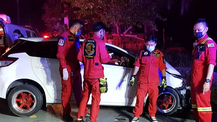 หนุ่มโคราชเหยียบเก๋ง Toyota Yaris สีขาว ซัดเสาไฟฟ้า บนถนนเมืองชลบุรี สภาพพังยับ ร่างถูกอัดติดคอนโซล กู้ภัยรุดช่วย-งัดร่างออกมา หวังยื้อชีวิต สุดท้ายไม่รอดดับสลด กู้ภัยเผยตัวผู้ตายมีกลิ่นเหล้าคลุ้ง ฝากเตือนเมาอย่าขับ-อยู่บ้านดีกว่า